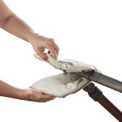 Manoplas para el manillar de la silla de paseo de Jané con interior de tejido polar y exterior en polipiel (Black y Crema) o tejido textil (Soil). Universal, aptas para manillar abierto o cerrado. 3 colores disponibles.