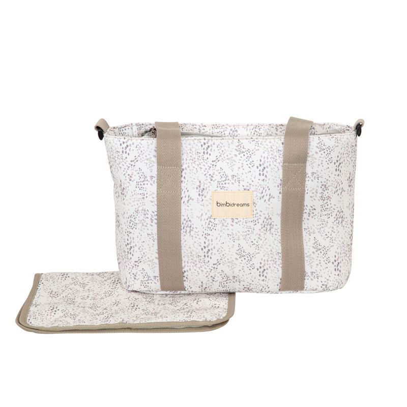 Bolso pañalera crossbody con cambiador de la colección Dots (blanco/lino) de Bimbidreams. Tejido de calidad certificado OEKO-TEX, fabricado en España.