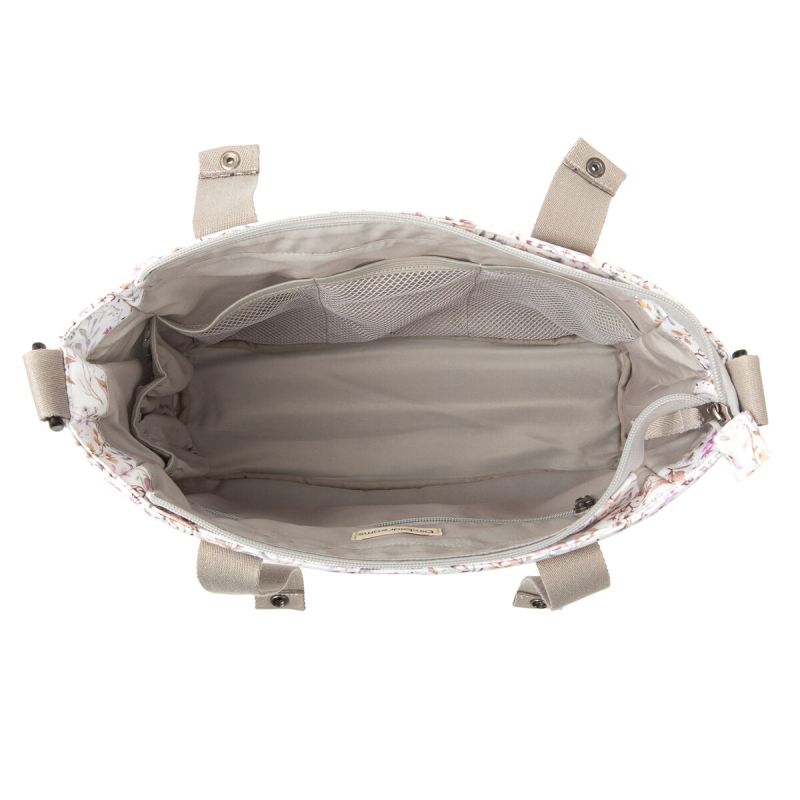 Bolso pañalera crossbody con cambiador de la colección Niza (blanco/lila) de Bimbidreams. Tejido de calidad certificado OEKO-TEX, fabricado en España.