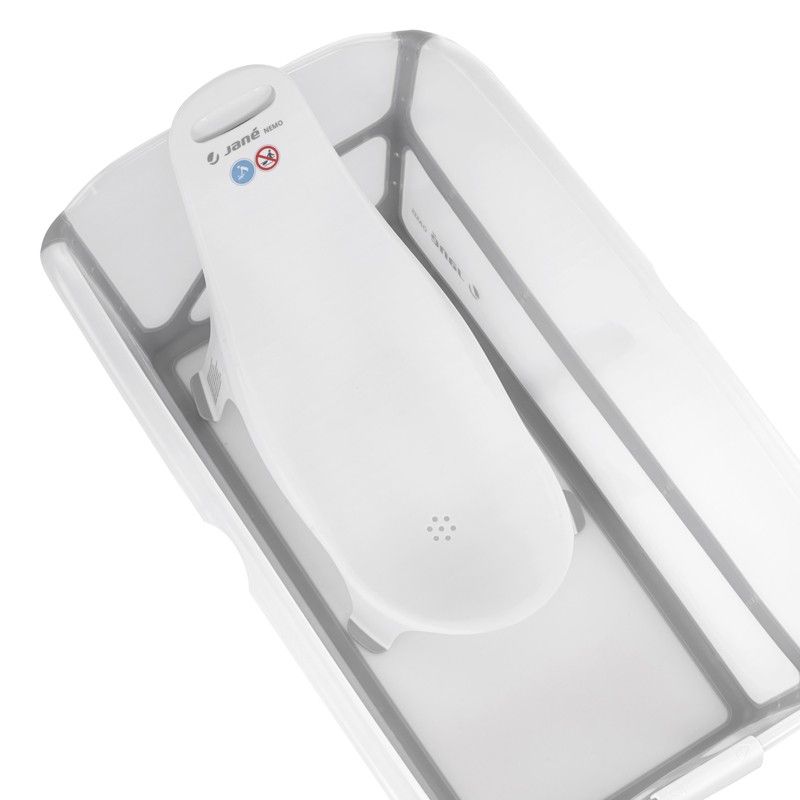 La Hamaca de baño Nemo de Jané (referencia 6650) es un reductor ergonómico en forma de tumbona que sostiene al recién nacido dentro de la bañera para que los padres puedan bañarlo con una sola mano. Jané, fabricante español con sede en Barcelona desde 1932, la diseña para usar desde el nacimiento hasta los 8 meses (aproximadamente, hasta que el bebé se mantiene sentado sin ayuda). Con sus 4 puntos de apoyo antideslizantes, pesa 1,6 kg y mide 51 × 24 × 41 cm. Está especialmente diseñada para acoplarse dentro de la Bañera plegable Oasis de Jané, pero también funciona en bañeras tradicionales con suficiente espacio.