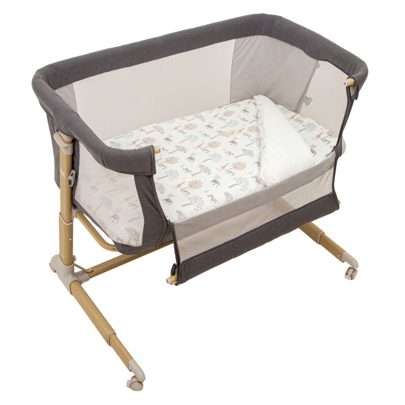 Minicuna colecho metálica con bajera y funda nórdica de la colección Tanzania (gris) de Bimbidreams. Tejido de calidad certificado OEKO-TEX, fabricado en España.
