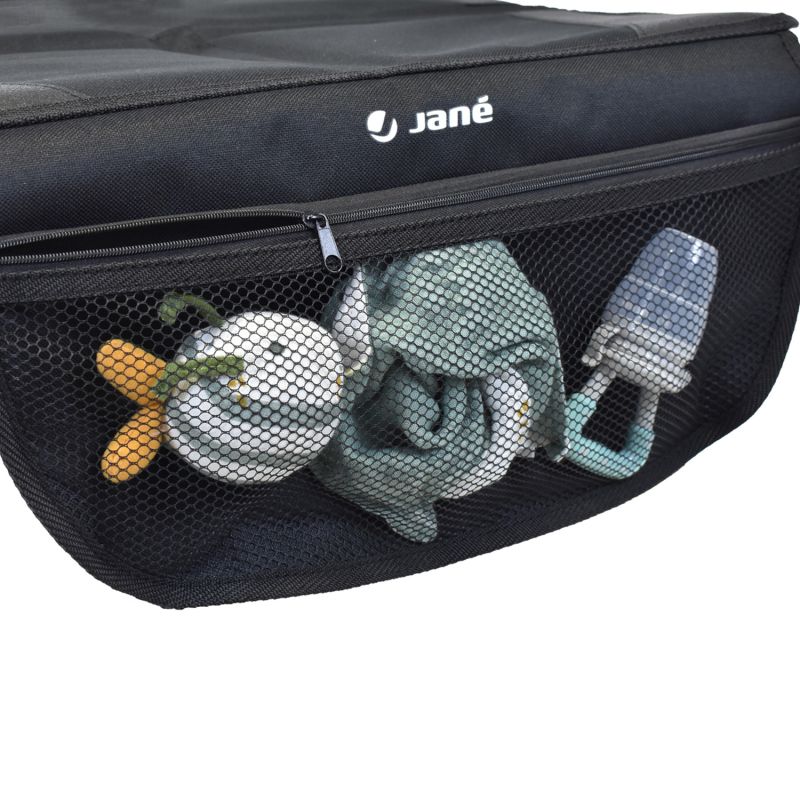 Este protector ha sido ensayado en los laboratorios de Jané bajo condiciones de alta temperatura y presión para garantizar la fiabilidad del tejido en uso diario: es impermeable y antimanchas, lo que significa que los derrames de biberón, zumos o cualquier otro líquido se limpian en segundos sin calar a la tapicería del coche. Incluye además un bolsillo de almacenaje en la parte inferior donde puedes guardar pañales, toallitas, juguetes pequeños u otros accesorios. Se abrocha fácilmente mediante tiras de sujeción con cierres regulables que se adaptan a la forma del asiento.
