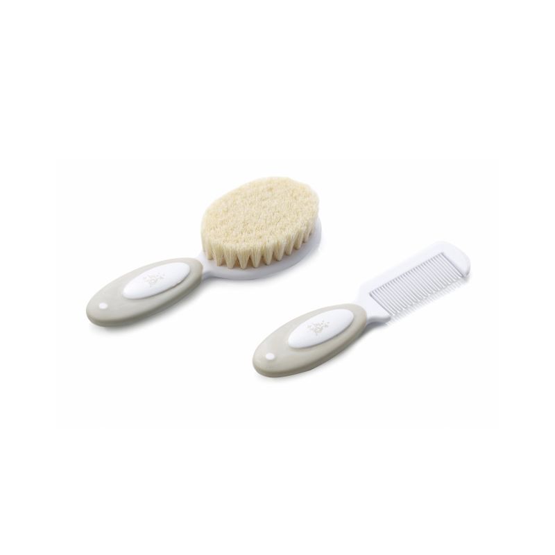 El set cepillo y peine de Jané en color Sand es un imprescindible del neceser del bebé desde los primeros días. Incluye un cepillo con cerdas suaves específicas para el cuero cabelludo delicado del recién nacido y un peine de púas finas para deshacer nudos sin tirar del pelo. Ambos tienen un mango ergonómico que facilita el agarre al padre o la madre durante el peinado.