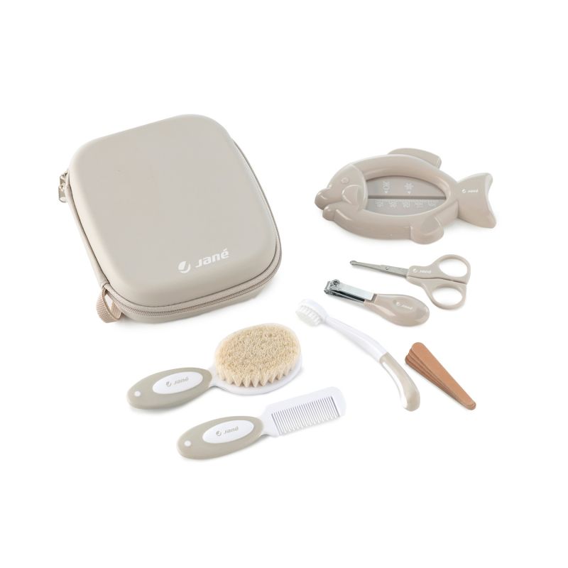 El Set de higiene con neceser de Jané (referencia 040221 U10 Sand) reúne en un neceser rígido con compartimentos los 8 utensilios básicos para el aseo del recién nacido: peine, cepillo de cerda natural, cepillo dental de silicona, tijeras de seguridad, cortaúñas y 4 limas de uñas. Jané, fabricante español con sede en Barcelona desde 1932, lo diseña pensando en el primer día en casa: todo lo necesario para las rutinas de aseo del bebé en un solo pack, sin tener que comprar cada pieza por separado. Apto desde el nacimiento, el neceser mide 9 × 5 × 16,5 cm plegado — tamaño ideal para maleta o bolso de paseo.