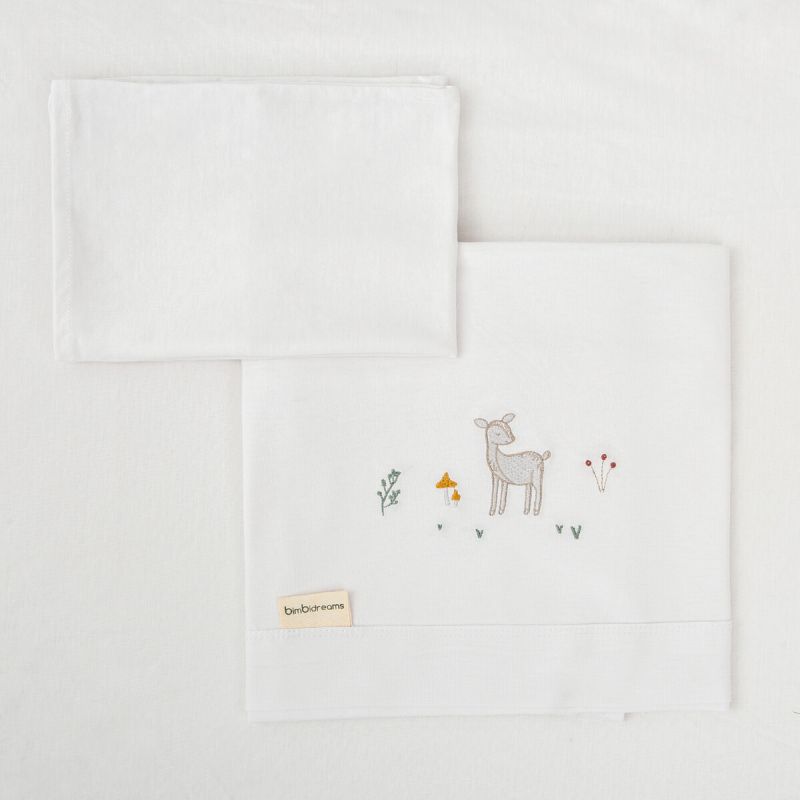 Juego completo de sábanas de tejido de punto para cuna de bebé de 60x120 cm, en la colección Deer de Bimbidreams. El tejido de punto aporta elasticidad, calidez y un tacto muy suave, ideal para la piel delicada del bebé. Incluye bajera ajustable, encimera y funda de almohada.