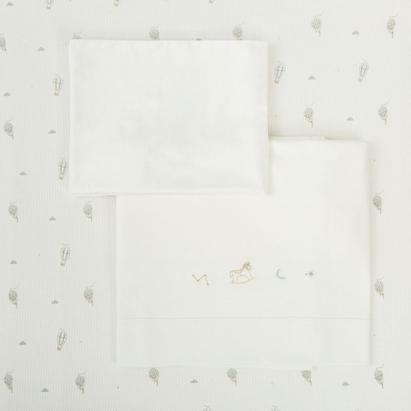 Juego completo de sábanas de tejido de punto para cuna mini de bebé de 50x80 cm, en la colección Blue Sky de Bimbidreams. El tejido de punto aporta elasticidad, calidez y un tacto muy suave, ideal para la piel delicada del bebé. Incluye bajera ajustable, encimera y funda de almohada.