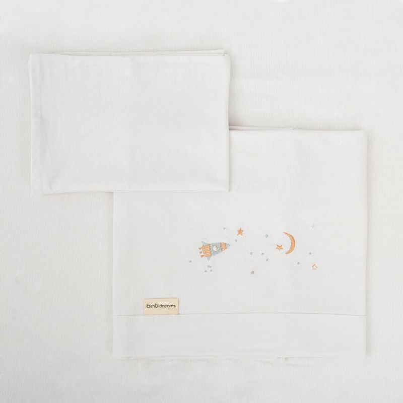 Juego completo de sábanas de tejido de punto para cuna mini de bebé de 50x80 cm, en la colección Orbit de Bimbidreams. El tejido de punto aporta elasticidad, calidez y un tacto muy suave, ideal para la piel delicada del bebé. Incluye bajera ajustable, encimera y funda de almohada.