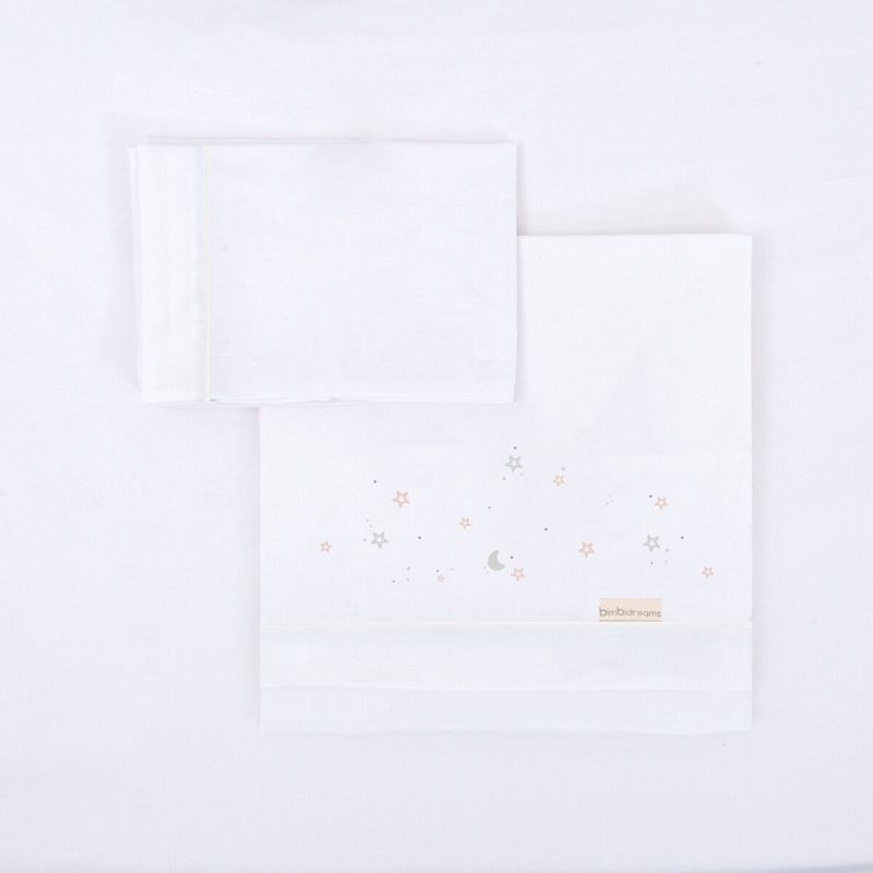 Tríptico sábanas 100% algodón cuna 60x120 de la colección Night (blanco/rosa) de Bimbidreams. Tejido de calidad certificado OEKO-TEX, fabricado en España.