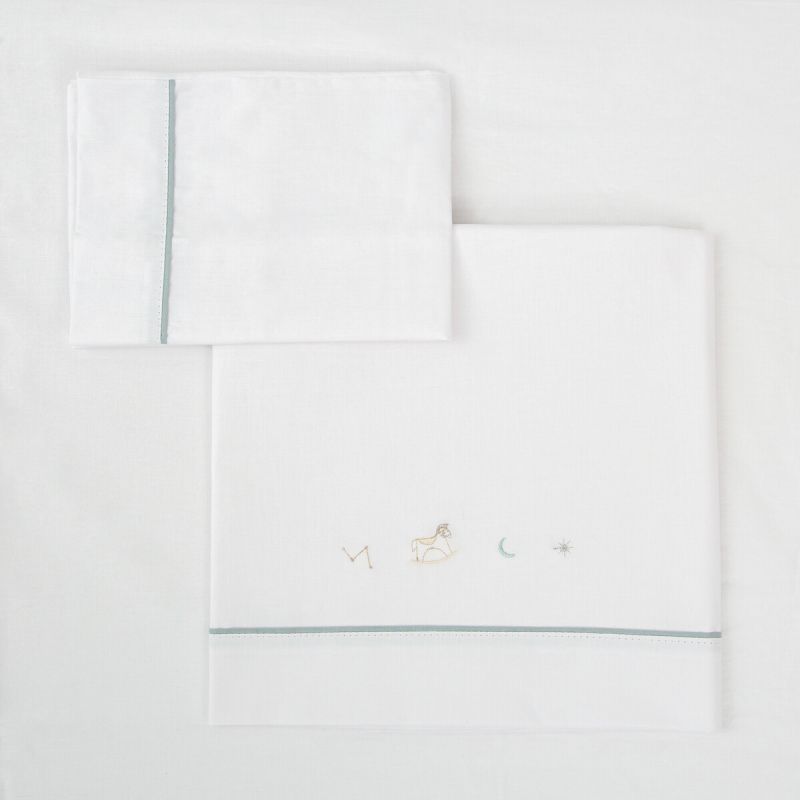 Tríptico sábanas 100% algodón cuna mini 50x80 de la colección Blue Sky (verde) de Bimbidreams. Tejido de calidad certificado OEKO-TEX, fabricado en España.