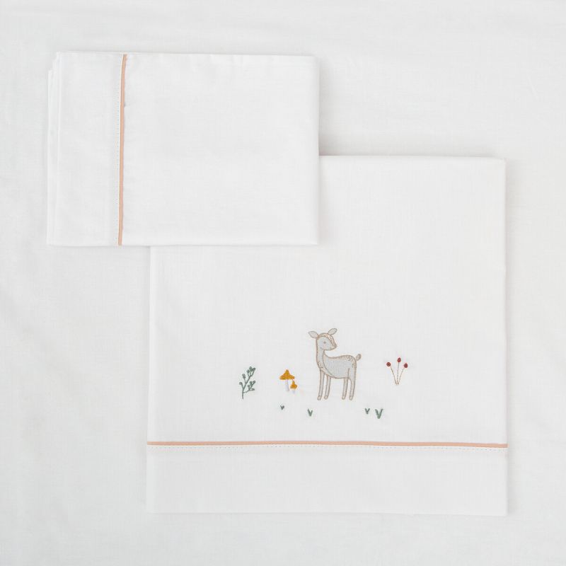Tríptico sábanas 100% algodón cuna mini 50x80 de la colección Deer (blanco/rosa) de Bimbidreams. Tejido de calidad certificado OEKO-TEX, fabricado en España.