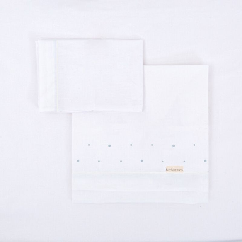 Tríptico sábanas 100% algodón cuna mini 50x80 de la colección Punts (blanco/azul) de Bimbidreams. Tejido de calidad certificado OEKO-TEX, fabricado en España.