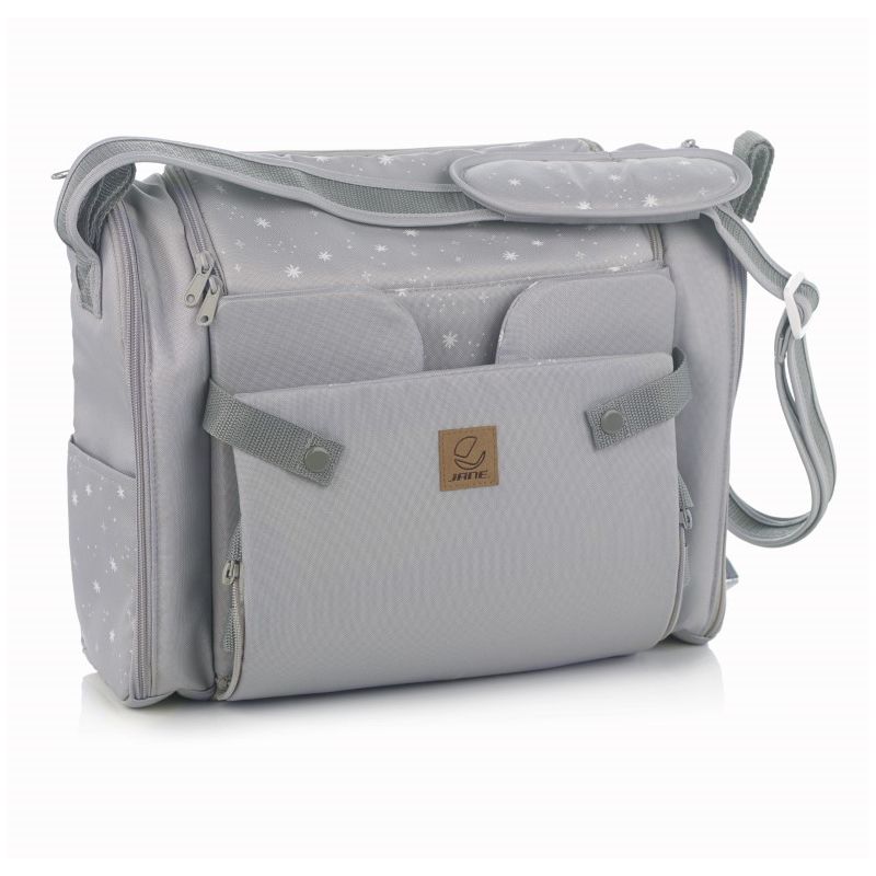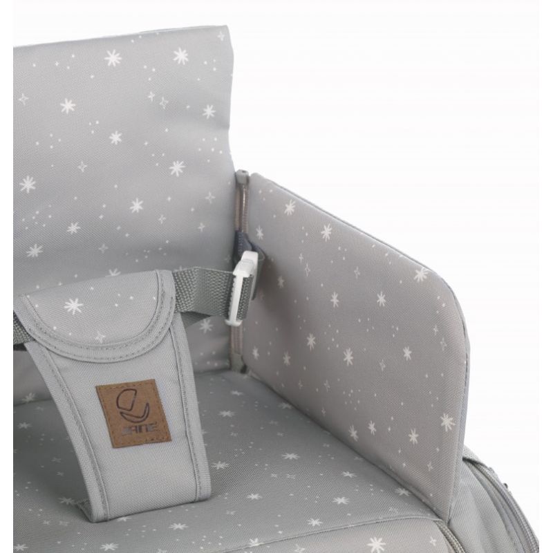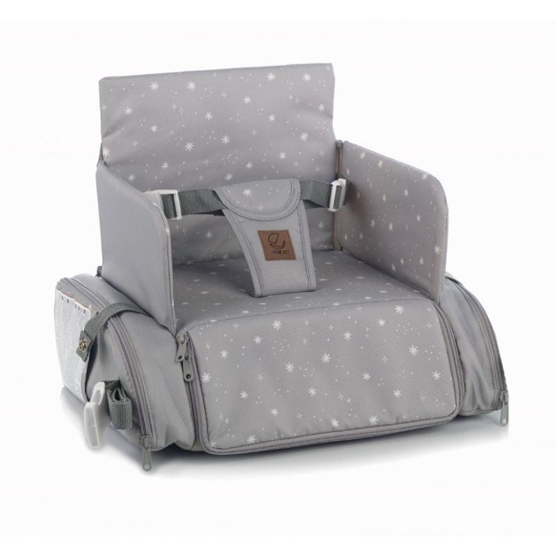 Asiento elevador de viaje con múltiples compartimentos que convierte cualquier silla en trona. 0-36 meses (hasta 15 kg), laterales reforzados patentados por Jané, bolsillos laterales con cremallera, cintas para colgar del cochecito. Tapizado antimanchas. Homologado UNE-EN 16120. Fabricado por Jané en España.